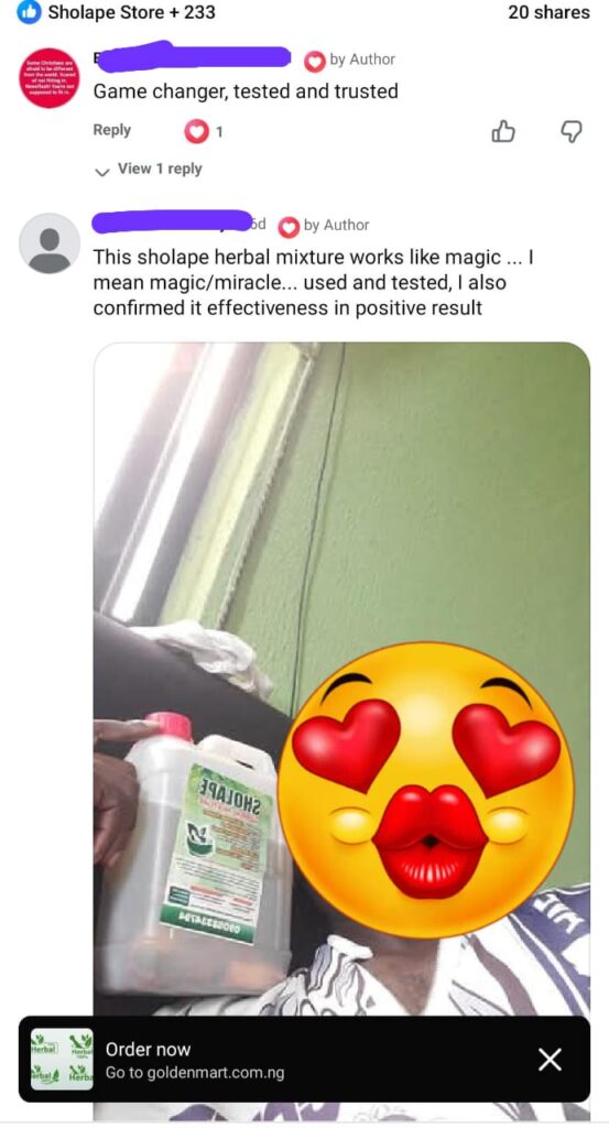 Any woman that has seen their man sexual performance change simply as a result of having to use this SHOLAPE HERBAL MIXTURE always recommend it to other women to give to their man and see the wonders of how they will begin to see a new side of the sexual part of their man.
